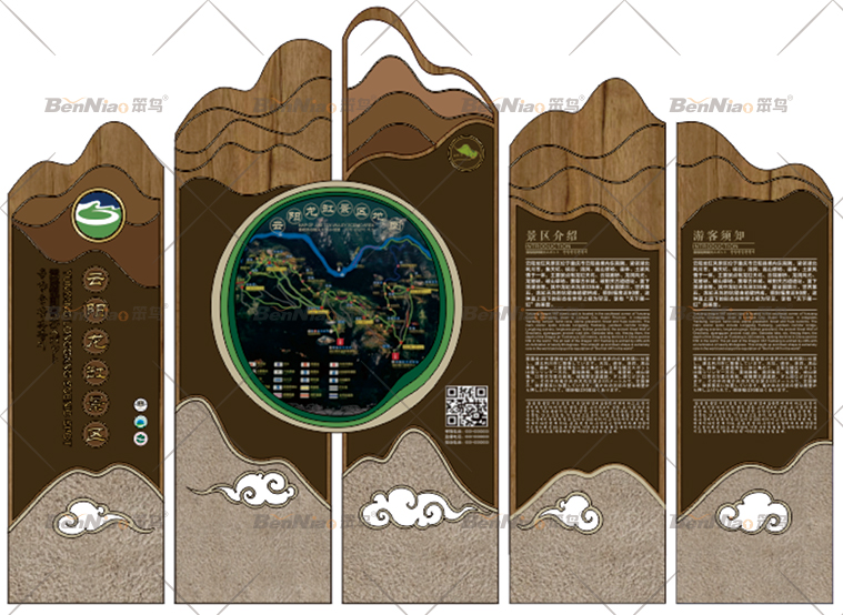景區(qū)標(biāo)識(shí)作為游客和景區(qū)之間文化體驗(yàn)的橋梁,笨鳥團(tuán)隊(duì)在設(shè)計(jì)中會(huì)強(qiáng)調(diào)景區(qū)標(biāo)識(shí)從選材到安裝都要與空間環(huán)境相協(xié)調(diào),營造和諧的氛圍使其相互映襯,從而達(dá)到既有利于生態(tài)保護(hù),又能很好地體現(xiàn)景區(qū)標(biāo)識(shí)設(shè)計(jì)制作特點(diǎn)的目的。因此在云陽龍缸景區(qū)中采用生態(tài)材質(zhì)作為景區(qū)的主要材料,而其他材料應(yīng)作為輔助材料。其制作工藝要達(dá)到精致、規(guī)范、堅(jiān)固耐用,文字和地圖不易腐蝕褪色。