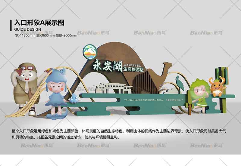 笨鳥文旅運用獨特的視角對本案進行思考設(shè)計,最終在永安湖生態(tài)旅游區(qū)入口景觀中延伸IP形象,在入口景觀設(shè)計中采用項目地勢造型,利用不同的造型混搭和IP形象融合,碰撞出多層次的藝術(shù)細節(jié)感。