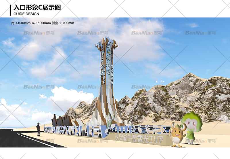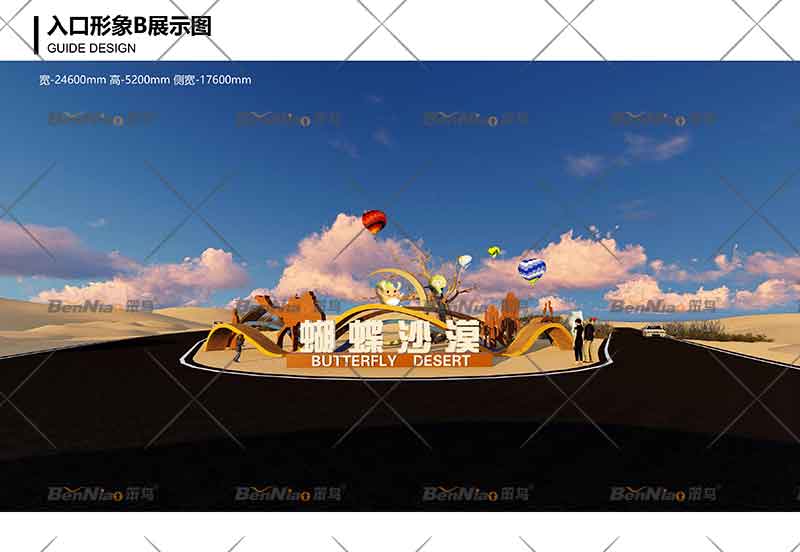 蝴蝶沙漠入口形象,基于項目地具有開闊視野和地勢的優(yōu)勢,在打造入口形象上著重突出其昭示作用,游客從遠處就可以清晰看見具有形式美感的入口形象與環(huán)境相融。笨鳥文旅設(shè)計師基于項目本身屬性定位,利用整體錯落有致的弧形布局,營造全方位的形象展示面,充分表達迎客之意。