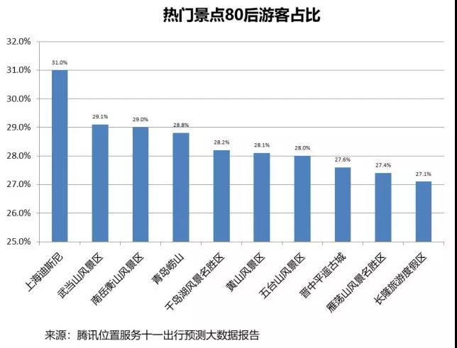 90后出游占比超三分之一,80后最愛上海迪斯尼據(jù)國家旅游局統(tǒng)計,2017年黃金周期間國內(nèi)旅游人數(shù)達(dá) 6.63 億人次。騰訊位置服務(wù)則預(yù)測,今年旅游人數(shù)將進(jìn)一步提升,其中男游客和女游客的比例約為58%:42%,大多數(shù)景點男游客都比女游客要多,但也有少數(shù)景點更受女游客青睞,最明顯的例子就是黃山,其三大景點皖南古村落(西遞)、古徽州潛口民宅和徽州古城,女游客的數(shù)量均多于男游客,承德避暑山莊、蘇州拙政園、北京恭王府等對女性的吸引力同樣高于其他景點。